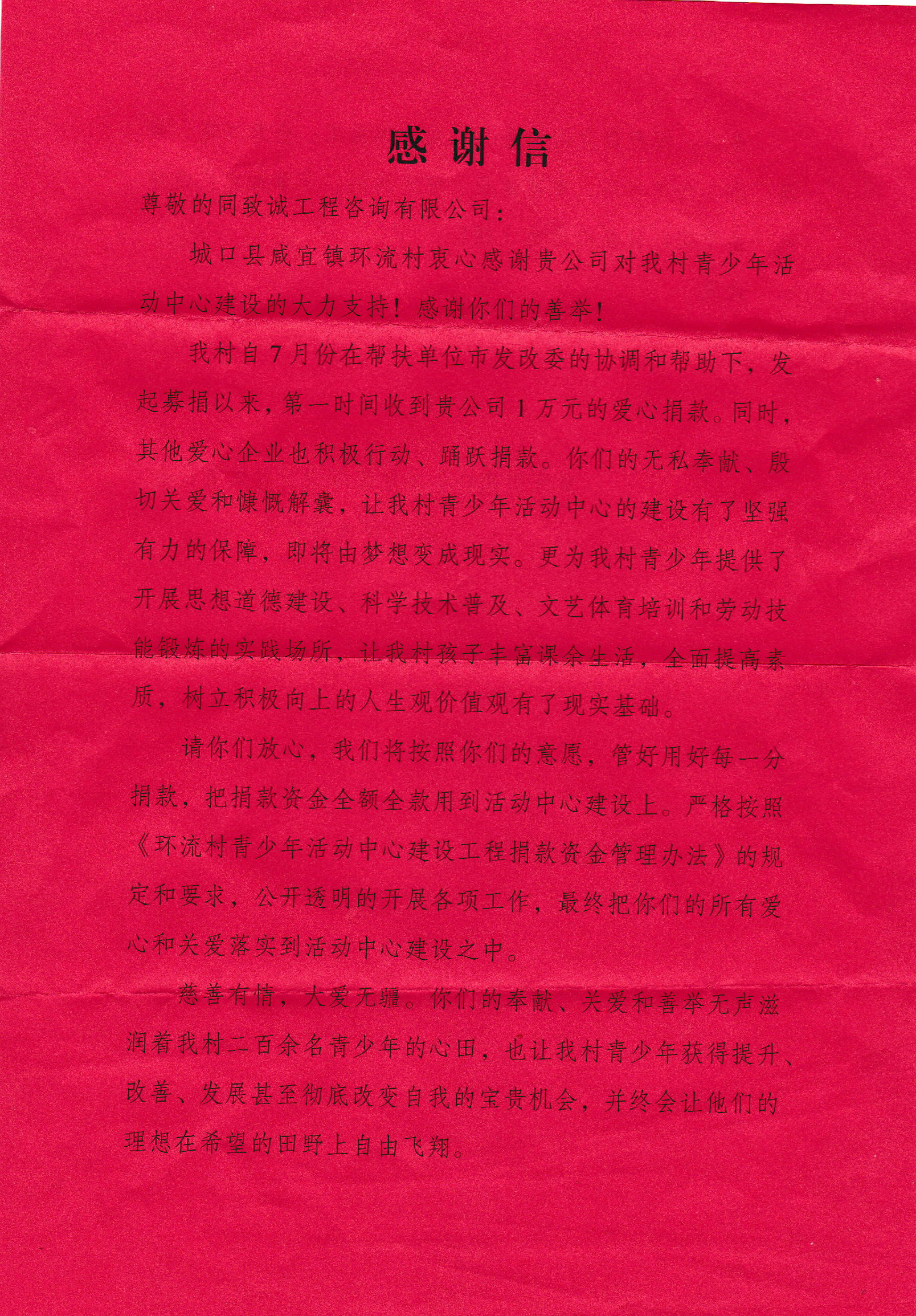 信中提及,城口縣咸宜鎮(zhèn)環(huán)流村為建設(shè)青少年活動中心在幫扶單位市發(fā)改委的協(xié)調(diào)和幫助下發(fā)起募捐。我司于第一時間獻出愛心,希望為孩子們的活動中心添磚加瓦。信中還表示,將管好用好每一分捐款,把捐款資金全額全款用到活動中心建設(shè)上,公開透明的開展各項工作。