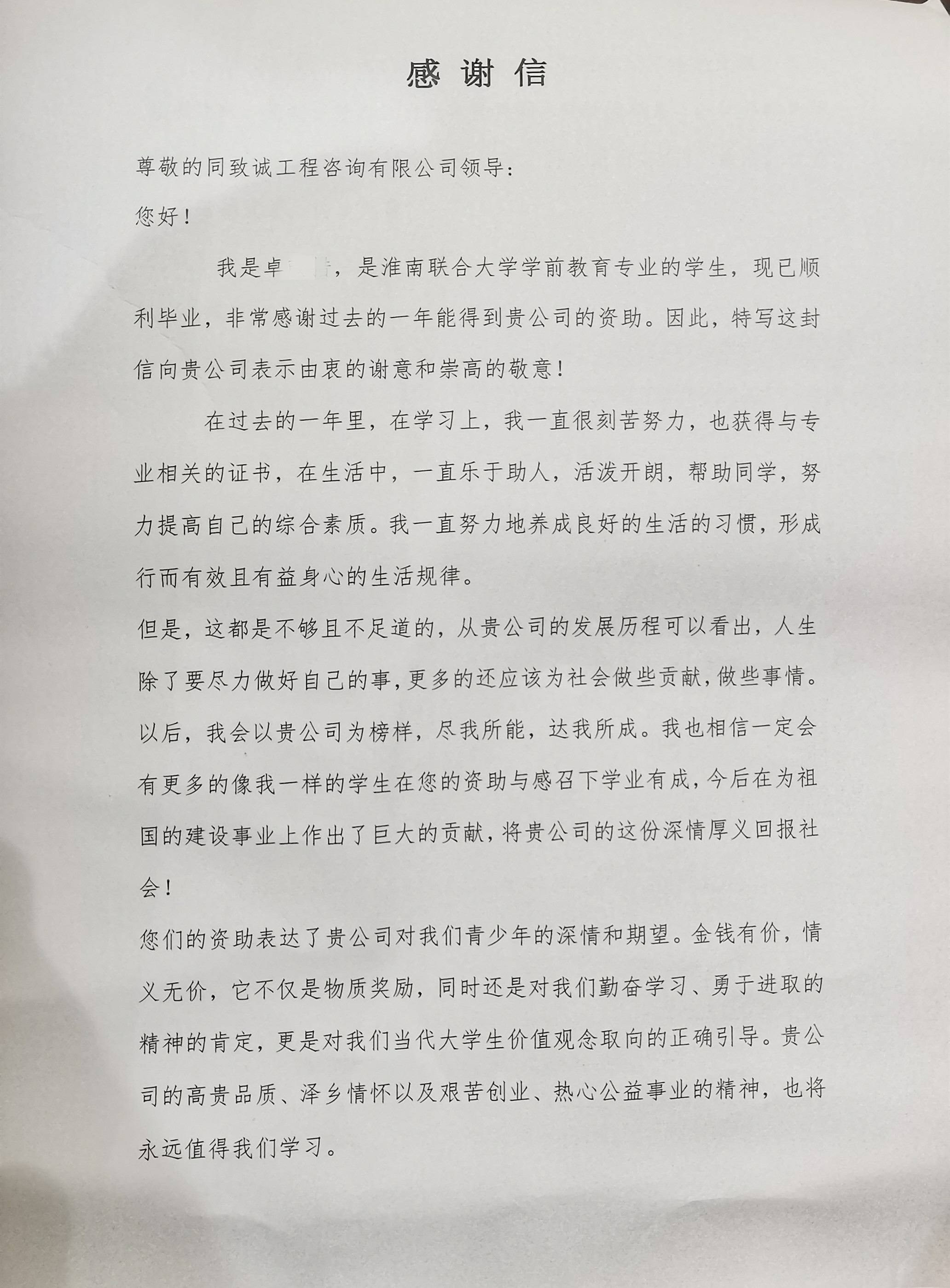 近日,同致誠工程咨詢有限公司收到重慶市城口縣咸宜鎮(zhèn)環(huán)流村村民委員會及淮南聯(lián)合大學(xué)學(xué)前教育專業(yè)卓同學(xué)寄來的兩封感謝信。信中表達了對公司愛心捐款行為的感激之情和努力回報社會之意。