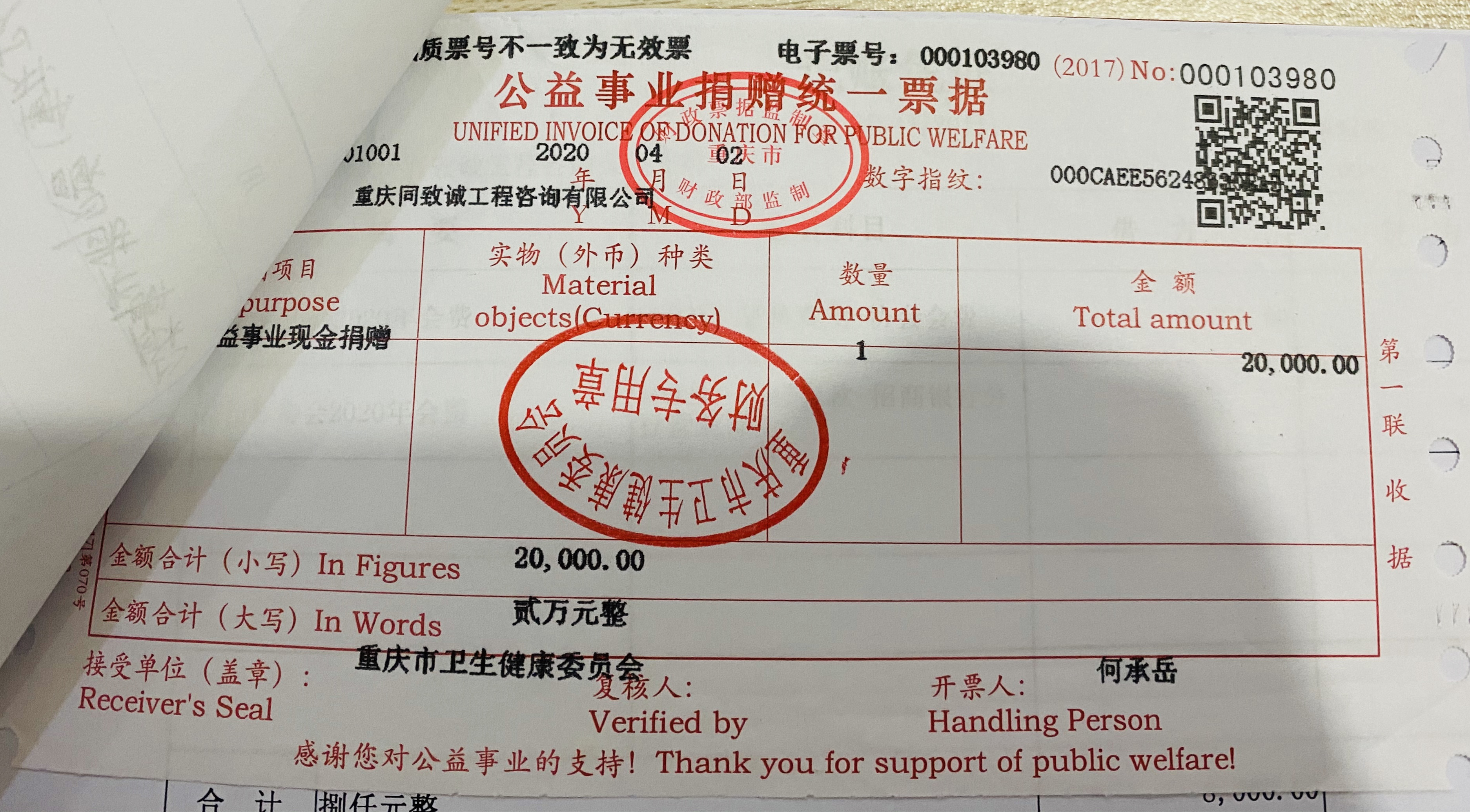 圖 | 為重慶市衛(wèi)生健康委員會愛心捐贈的票據(jù)