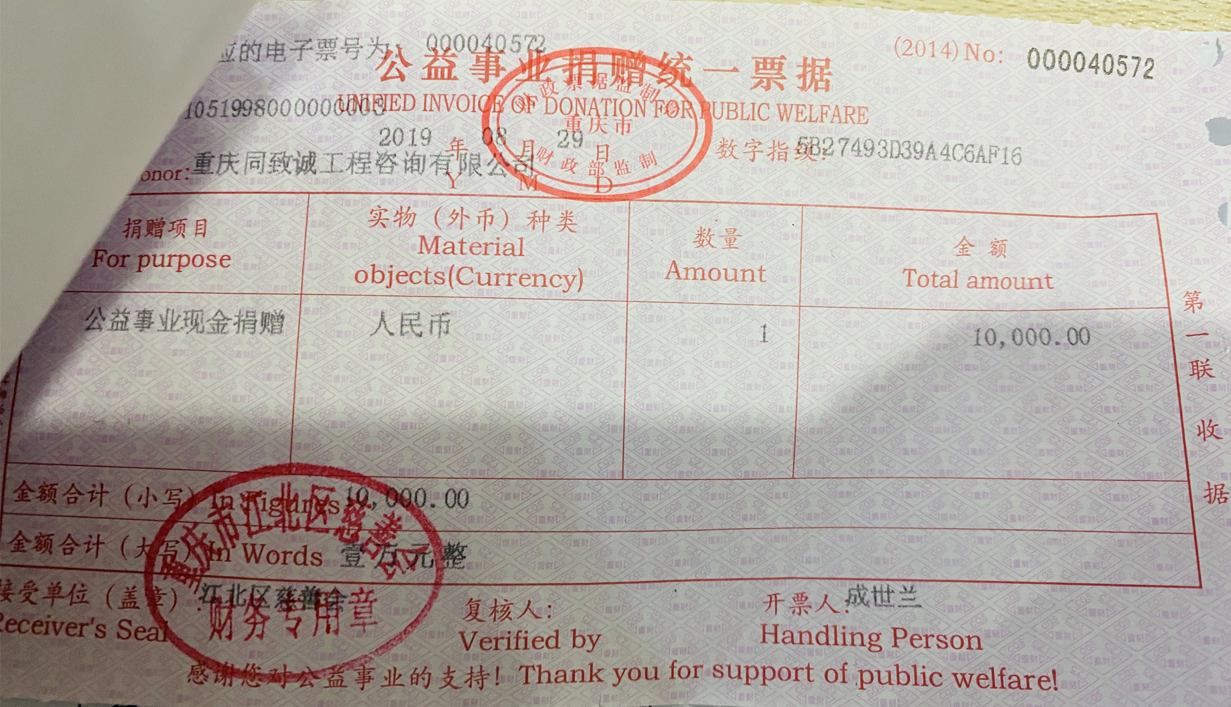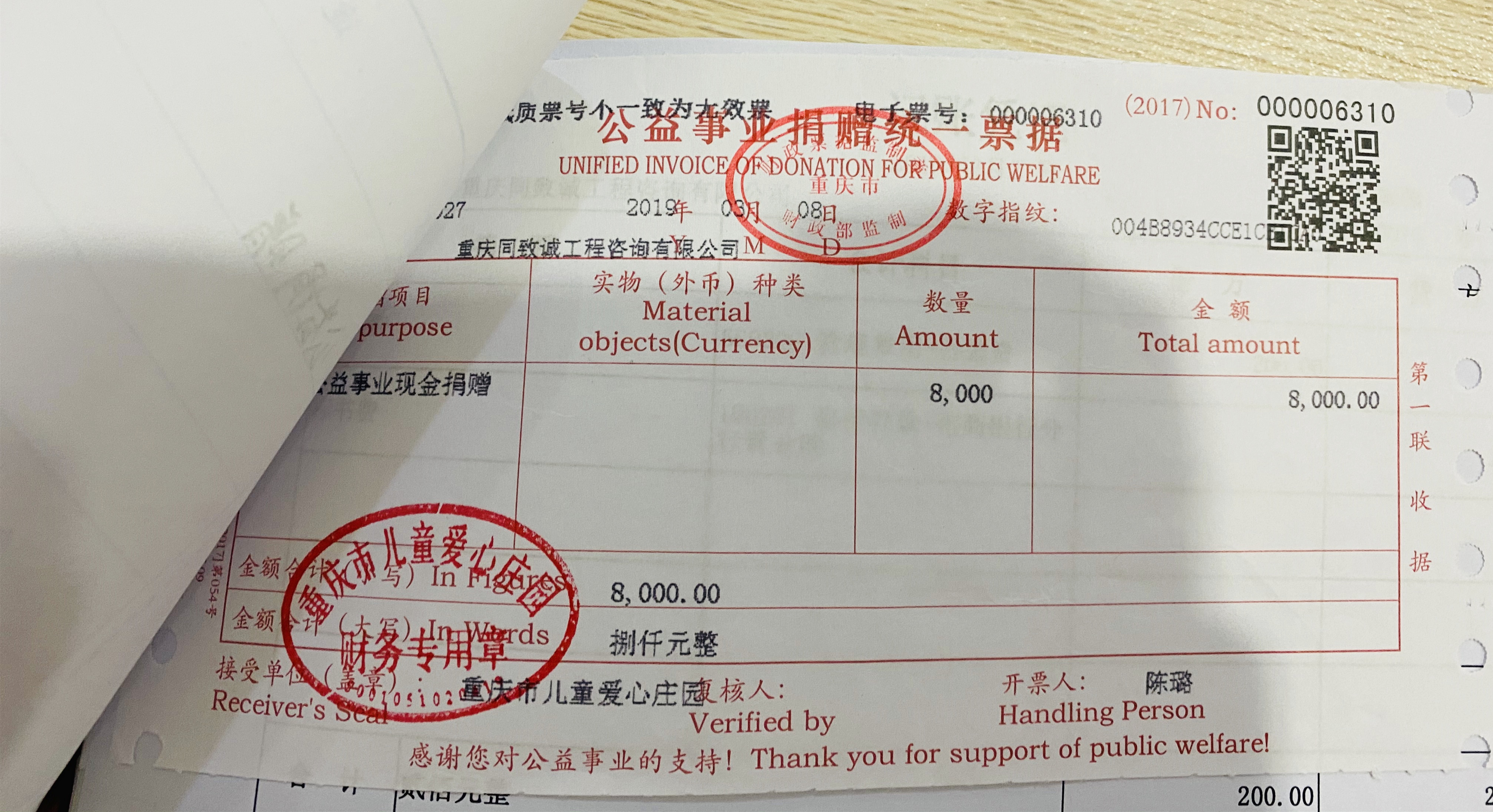 圖 | 為重慶市兒童愛心莊園愛心捐贈的票據(jù)