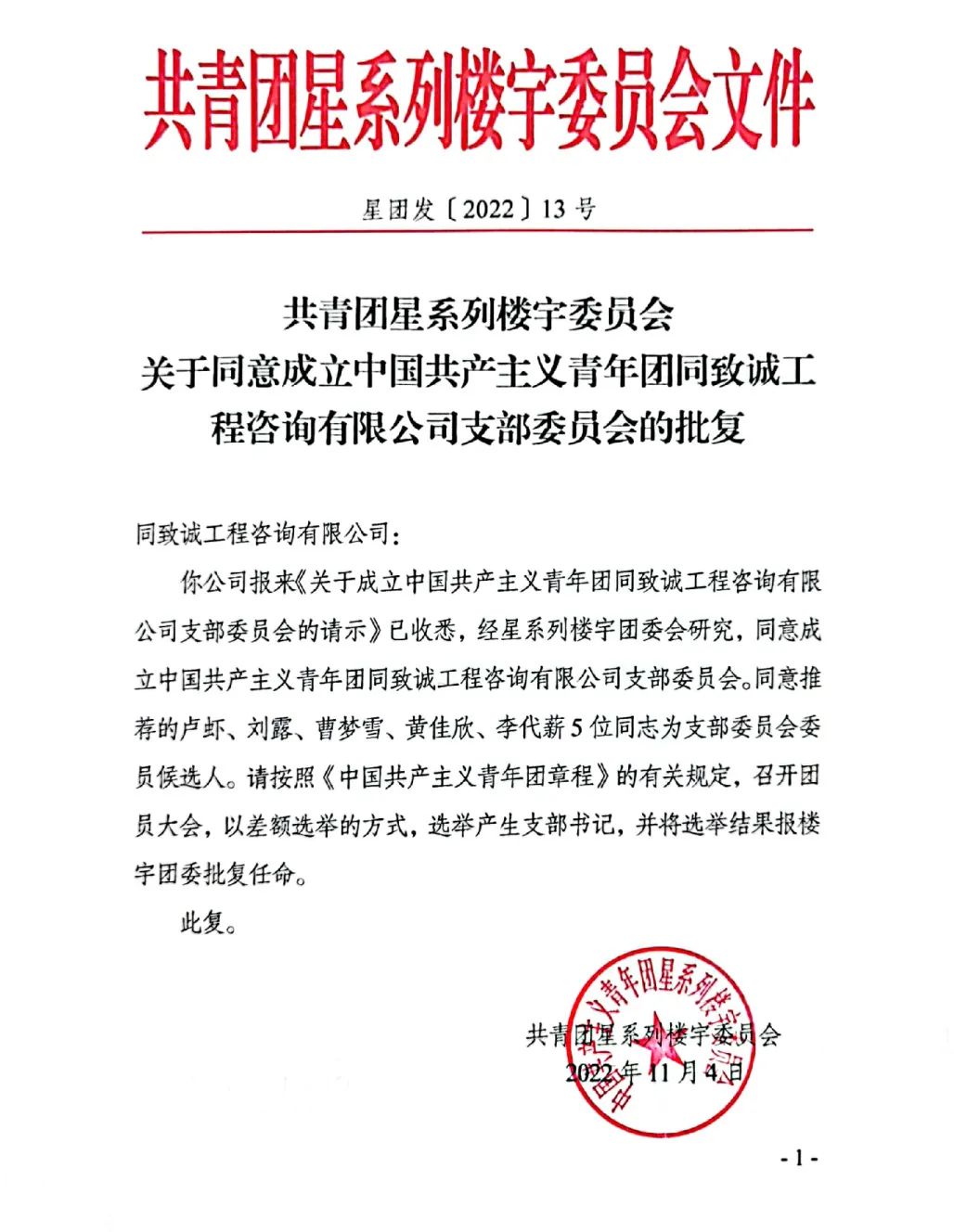 關(guān)于同意成立中國共產(chǎn)主義青年團(tuán)同致誠工程咨詢有限公司支部委員會的批復(fù)