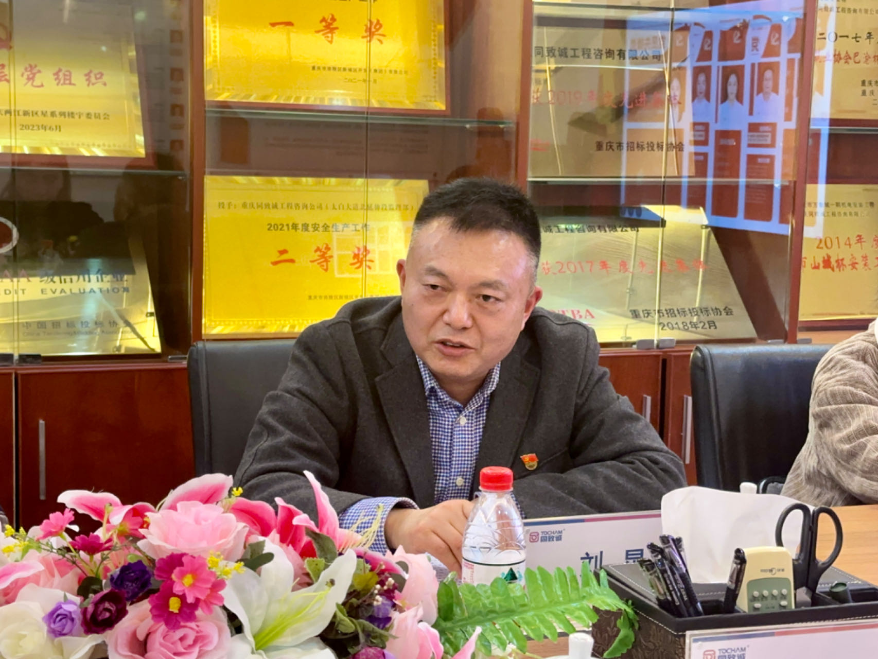 會上,張董事長對劉書記的到訪表示熱烈歡迎和感謝,并從集團(tuán)公司工程咨詢、檢測、產(chǎn)教融合、海外事業(yè)四大版塊做了全面介紹。張董事長說:“2003年,我開始創(chuàng)業(yè),經(jīng)過20年的發(fā)展公司取得了一些成績,黃桷灣立交、重慶江北國際機(jī)場T3航站樓等等都有同致誠的身影。但是現(xiàn)在受大環(huán)境影響,企業(yè)經(jīng)營有一定的困難,也希望黨委、政府多支持民營企業(yè)發(fā)展!