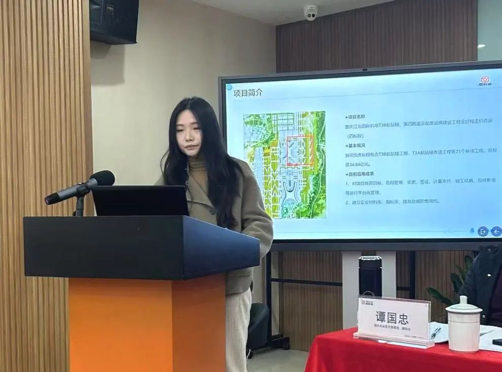 此外,負(fù)責(zé)公司技術(shù)監(jiān)審工作的陳俊君還詳細(xì)匯報了我司在重慶江北國際機(jī)場T3B航站樓、第四跑道及配套設(shè)施建設(shè)工程全過程造價咨詢(四標(biāo)段)中,運用數(shù)字新咨詢生產(chǎn)力平臺的使用效果。