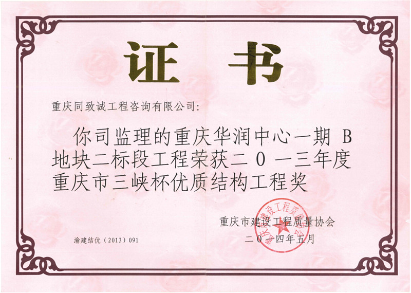 2013年重慶市三峽杯優(yōu)質(zhì)結(jié)構(gòu)工程獎“華潤中心一期B地塊二標(biāo)段”