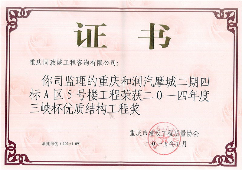 重慶和潤汽摩城二期四標(biāo)A區(qū)5號樓工程榮獲二0一四年度三峽杯優(yōu)質(zhì)結(jié)構(gòu)工程獎