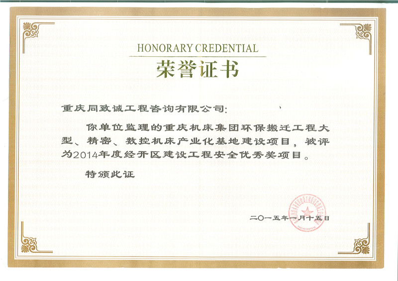 重慶機(jī)床集團(tuán)環(huán)保搬遷工程大型、精密、數(shù)控機(jī)床產(chǎn)業(yè)化基地建設(shè)項目被評為2014年度經(jīng)開區(qū)建設(shè)工程安全優(yōu)秀獎項目