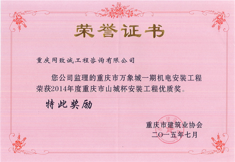 重慶市萬象城一期機(jī)電安裝工程榮獲2014年度重慶市山城杯安裝工程優(yōu)質(zhì)獎
