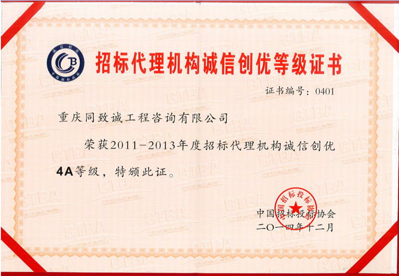 2011-2013招標代理機構誠信創(chuàng)優(yōu)4A等級