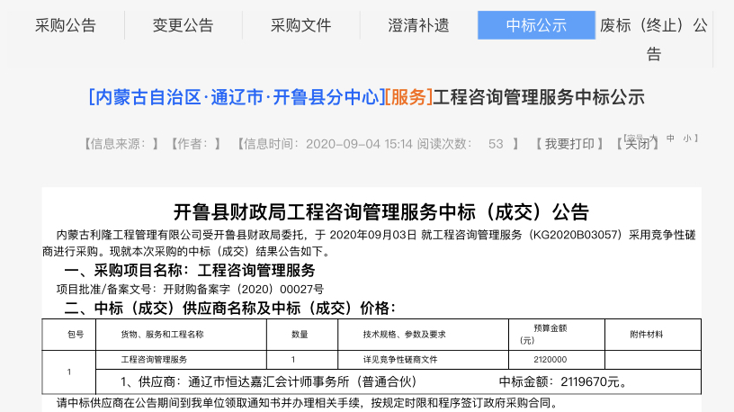 2020年9月3日,重慶同致誠工程咨詢有限公司與通遼市恒達(dá)嘉匯會(huì)計(jì)師事務(wù)所組成聯(lián)合體,中標(biāo)“開魯縣財(cái)政局工程咨詢管理服務(wù)” 供應(yīng)商,中標(biāo)金額為2119670元。