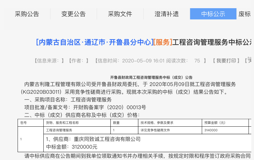 2020年5月9日,重慶同致誠工程咨詢有限公司中標(biāo)“開魯縣財(cái)政局工程咨詢管理服務(wù)” 供應(yīng)商,中標(biāo)金額為3120000元。