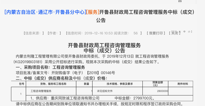2019年12月13日,重慶同致誠工程咨詢有限公司中標(biāo)“開魯縣財(cái)政局工程咨詢管理服務(wù)” 供應(yīng)商,中標(biāo)金額為2799700元。