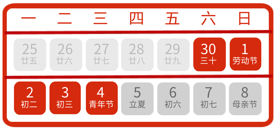 從2022年4月30日(星期六)至2022年5月4日(星期三)放假,共5天;5月7日(星期六)正常上班。