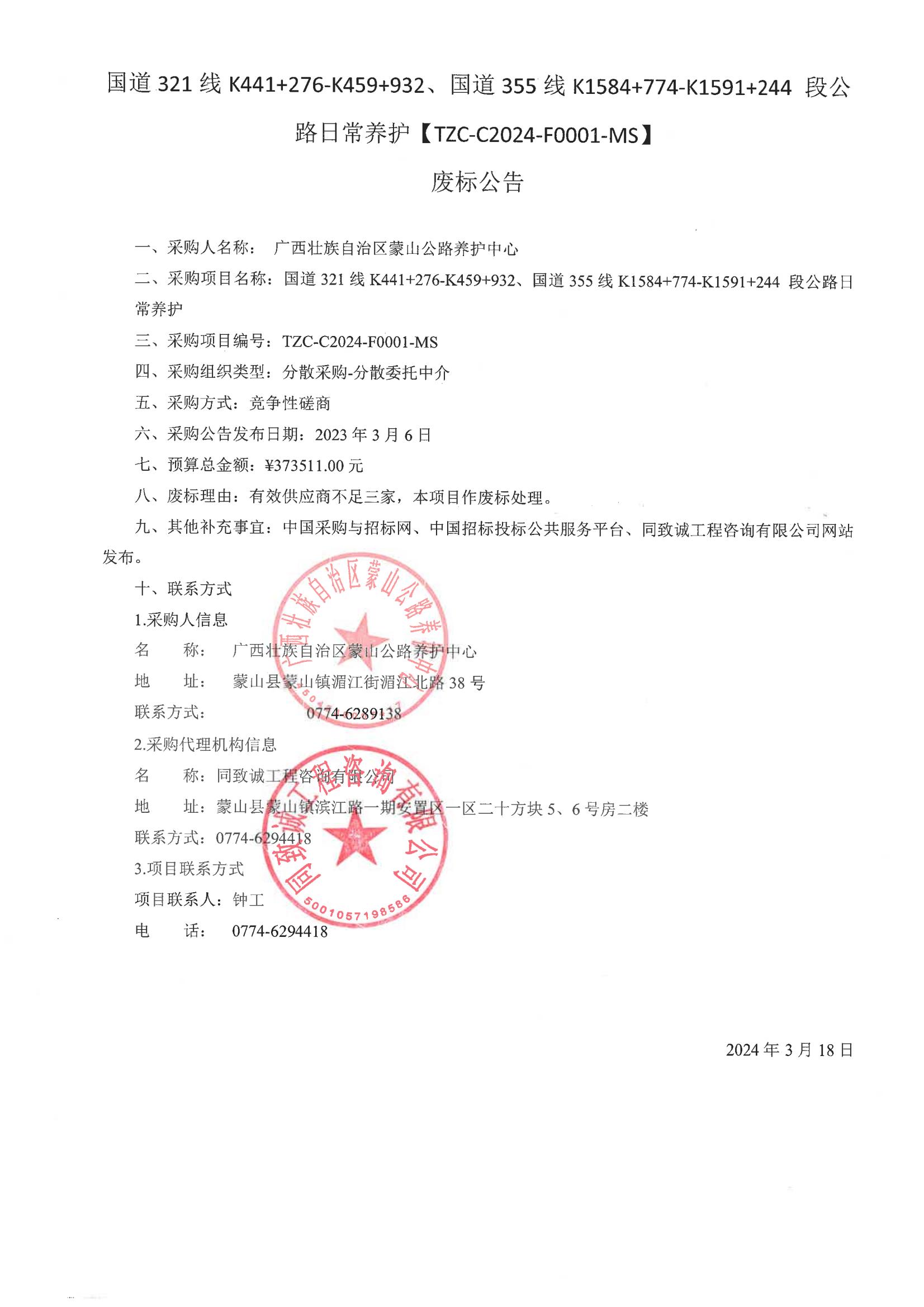 國道321線K441+276-K459+932、國道355線K1584+774-K1591+244 段公路日常養(yǎng)護廢標(biāo)公告