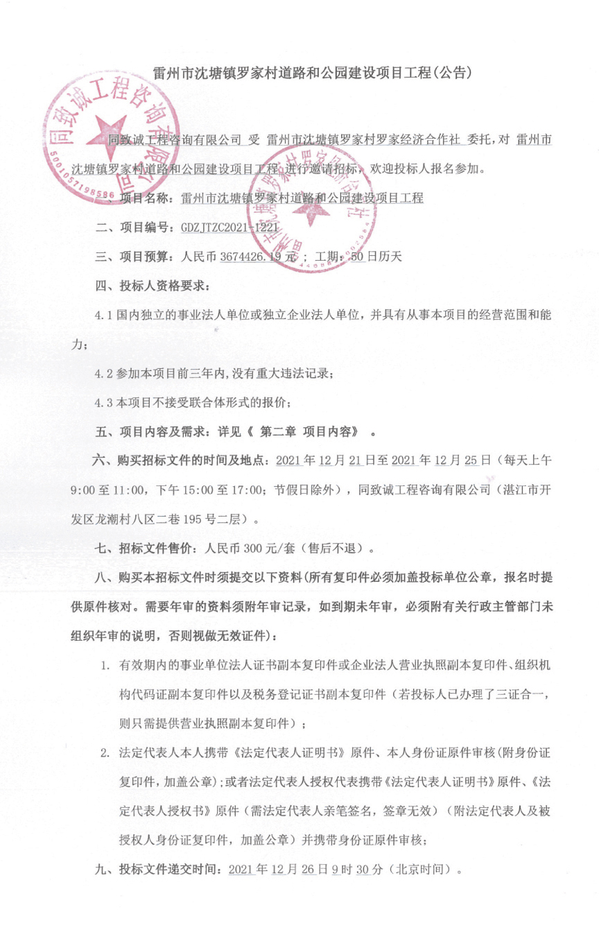 雷州市沈塘羅家村道路和公園建設項目工程公告